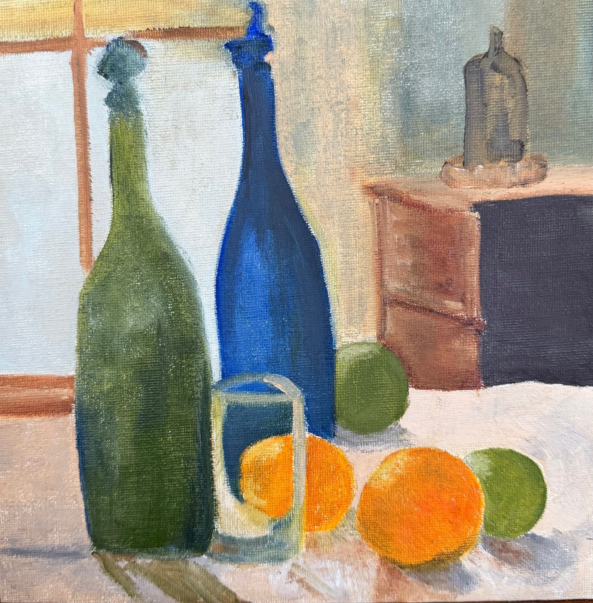 A still life painting featuring two tall bottles, one green and one blue, positioned on a table. In front of the bottles is a transparent glass with orange and lime fruits. The background includes a muted interior setting with a window casting soft light, as well as a wooden piece of furniture on the right side with another small, bottle placed on top.