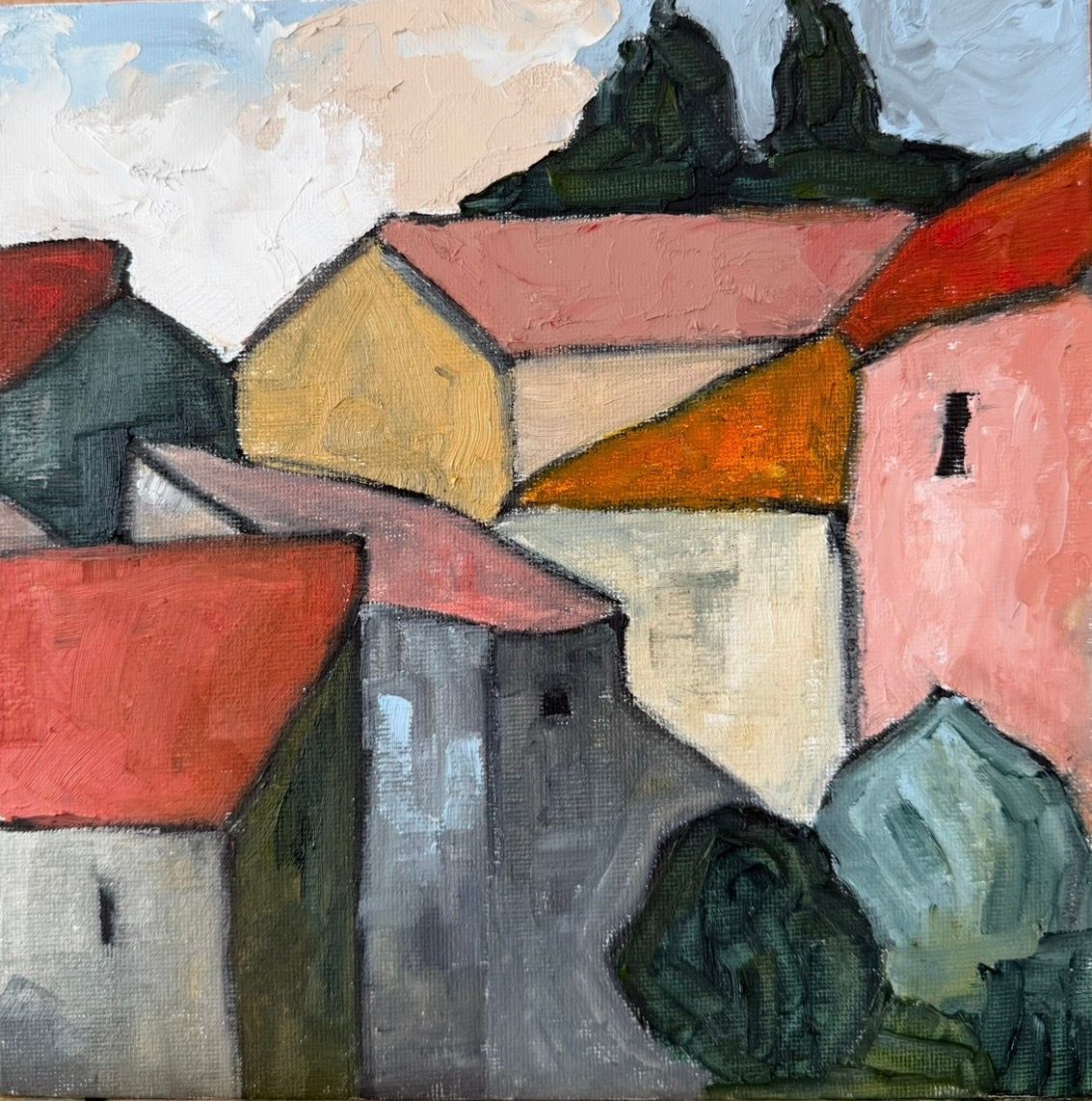 This artwork is a painting, depicting a cluster of buildings with simple geometric shapes and muted earthy color palette. The rooftops are composed of warm tones and shades of red, orange, and yellow, contrasted by the cooler, gray and blue shades of the building walls. There are minimal architectural details, with small dark windows or openings on some buildings adding depth. The background includes dark, green shades for trees and foliage, and the sky shows soft, textured clouds in the upper left corner. The brushstrokes are visible, giving the painting, a textured and somewhat abstract quality focused on form and color rather than detailed realism.