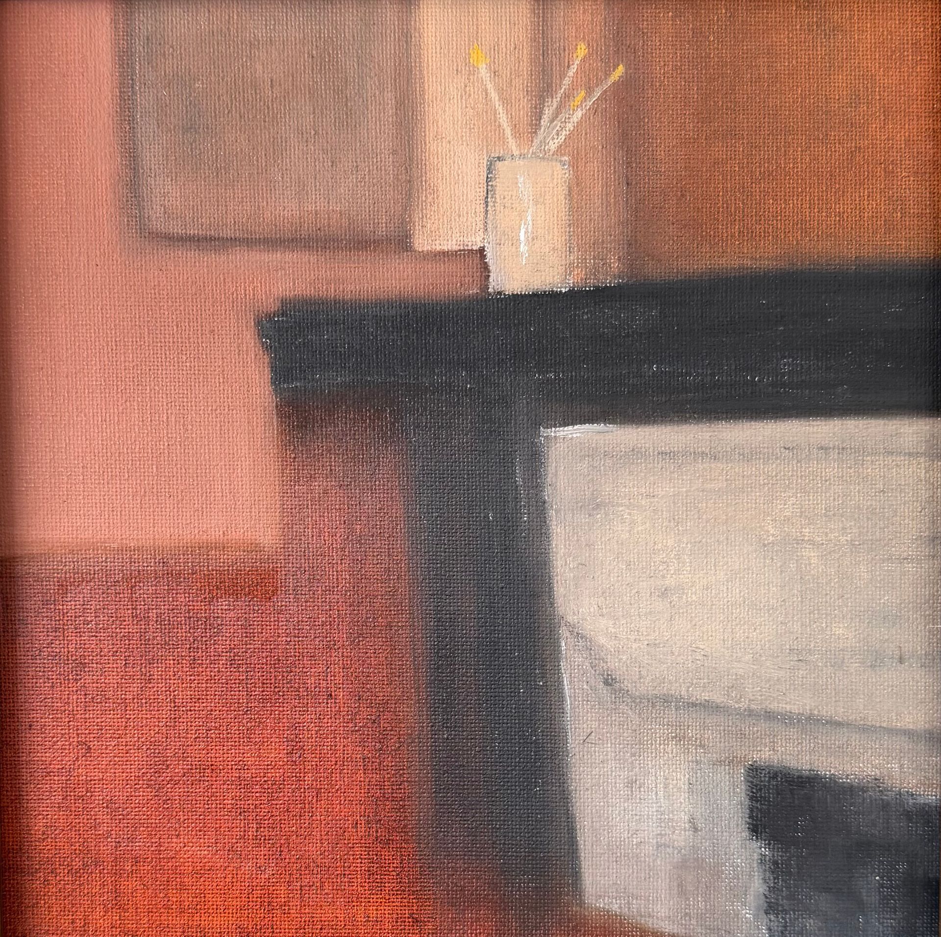 The artwork is a minimalist painting featuring a portion of an interior space, a black rectangular mantle dominates the center, resting above a light beige fireplace. On top of the mantle, there is a small cylinder containing paint brushes. The background is composed of muted warm tones of reddish dark brown and soft beige, with a subtle contrast between the flat, smooth wall behind and the textured surface of the mantle and fireplace.