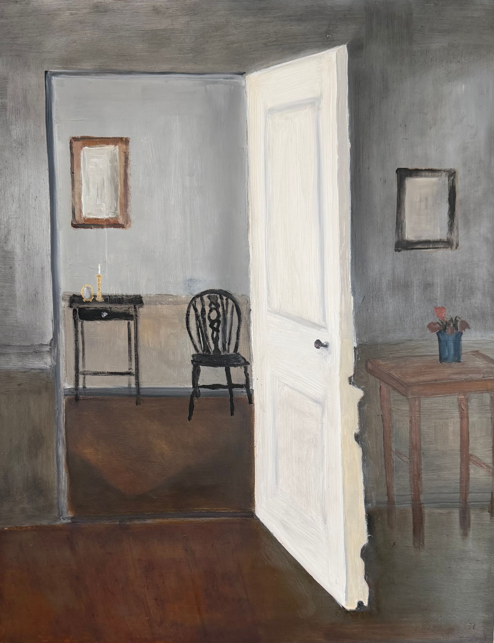 The artwork presents an interior scene with a focus on an open white door leading to an adjacent room. The foreground features a simple wooden table with a blue vase holding a few flowers. The visible adjacent room contains a black wooden chair with a